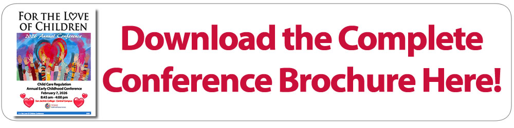 We are pleased to announce Child Care Regulation’s third annual “For the Love of Children Conference,” scheduled for Saturday, February 7, 2026 at San Jacinto College – Central Campus! This year’s conference will offer participants the opportunity to earn 6 clock hours of high-quality professional development on a wide variety of topics. We are also please to let you know that the conference will be larger in scale this year, as we are opening registration up to 800 people!